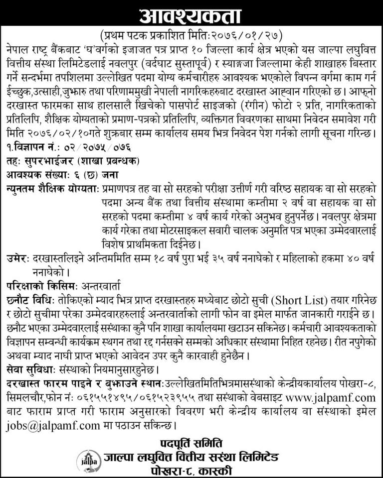 जाल्पा लघुवित्त वित्तीय संस्था लिमिटेडले केहि कर्मचारी माग गरेको छ । लघुवित्तले सुपरभाईजर (शाखा प्रबन्धक) पदमा ६ जना कर्मचारी माग गरेको हो ।