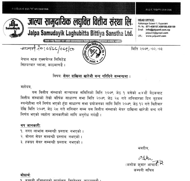 साधारण सभा प्रयोजनका लागि भने जेठ १२ गतेदेखि सभा हुने दिनसम्म बुक क्लोज गर्ने मिति कम्पनीले तय गरिसकेको छ । बुक क्लोजको आधारमा जेठ ११ गतेसम्म कायम शेयरधनीहरु मात्र सभामा भाग लिन सक्नेछन् ।