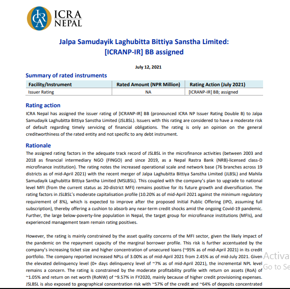 काठमाडौं । जाल्पा सामुदायिक लघुवित्त वित्तीय संस्था लिमिटेडले आईपीओ निष्काशन गर्नका लागि इक्रा नेपालमा रेटिङ गराएको छ । कम्पनीले निष्काशन गर्न लागेको आइपीओलाई इक्रा नेपालले इक्रा आइआर बिबि रेटिङ प्रदान गरेको छ ।