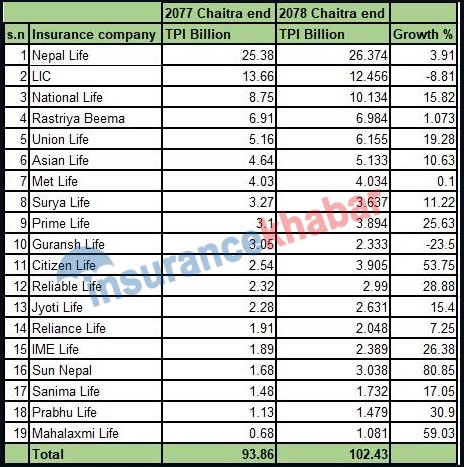 कूल बीमाशुल्क आम्दानीको हिसाबले सबैभन्दा ठूलो हिस्सा ओगटेको नेपाल लाइफले बीमाशुल्क आम्दानी जम्मा ३.९१ प्रतिशतले बढाएको छ । अर्को ठूलो जीवन बीमक एलआइसी नेपालको कुल बीमाशुल्क आम्दानी गत आर्थिक वर्षको चैत्र मसान्तको तुलनामा ८.८१ प्रतिशतले गिरावट आएको छ ।