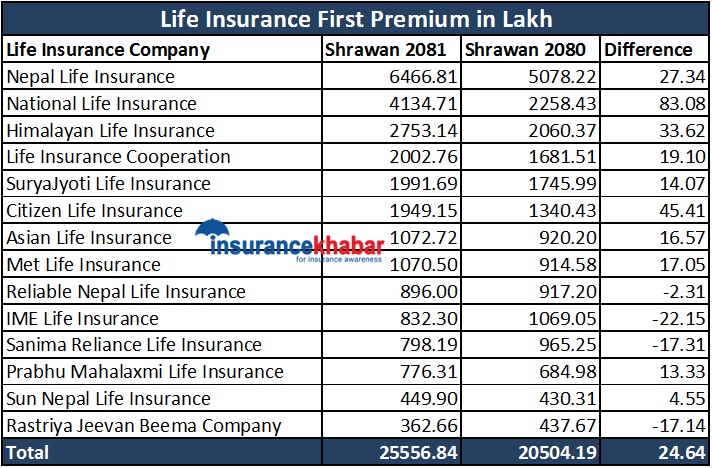 नेपाल बीमा प्राधिकरणले सार्वजनिक गरेको तथ्यांकअनुसार १४ वटा जीवन बीमा कम्पनीले साउनमा २ अर्ब ५५ करोड ५६ लाख रुपैयाँ प्रथम बीमाशुल्क आर्जन गरेका हुन्। यो प्रथम बीमाशुल्क गत आर्थिक वर्ष २०८०।८१ को साउनको तुलनामा २४.६४ प्रतिशतले बढी हो। गत वर्ष यही अवधिमा कम्पनीहरुले २ अर्ब ५ करोड ४ लाख रुपैयाँ प्रथम बीमाशुल्क आर्जन गरेका थिए।
