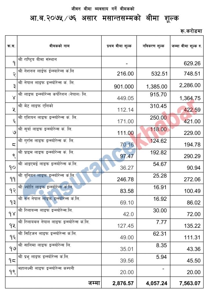 बीमा समितिमा बुझाएको विवरण अनुसार गत आर्थिक वर्षमा २० वटा बीमा कम्पनीहरु प्रथम जीवन बीमा शुल्कबापत २८ अर्ब ९३ करोड रुपैयाँ आर्जन गरेका छन् । त्यस्तै नविकरण बापत ४० अर्ब ५७ करोड रुपैयाँ शुल्क आर्जन गर्न सफल भएका छन् ।