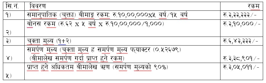 यदि कसैले बीमाङ्क रु.१०,००,०००/- को १५ वर्षको जीवन बीमा गरेको छ र लगातार ५ वर्षको पुरा बीमाशुल्क भुक्तान गरी ५ वर्ष पश्चात बीमितले कर्जा लिदा पाउने रकम र समर्पण गर्दा पाउने रकम, उक्त अवधिको कम्पनीको घोषित बोनस दर रु.६२/-(प्रति वर्ष प्रति हजार बीमाङ्कमा) रहेछ भने निम्नानुसार हुन्छ । उदाहरण: