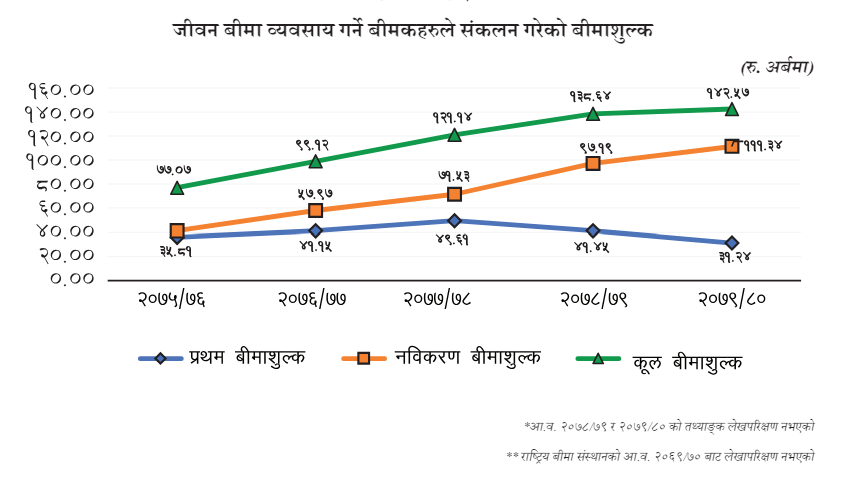 प्राधिकरणका अनुसार पछिल्लो पाँच वर्षको अवधिमा जीवन बीमकहरुको कूल बीमाशल्क संकलन क्रमिक रुपमा बढ्दै गएको छ । आ.व. २०७५/७६ मा जीवन बीमकले कूल बीमाशुल्क ७७ अर्ब ७ करोड रूपैयाँ संकलन गरेकोमा गत आ.व. २०७९/८० सम्म आइपुग्दा बढेर १ खर्ब ४२ अर्ब रूपैयाँ नाघेको छ। यसैगरी नविकरण बीमाशुल्क वापत गत आवमा जीवन बीमकले १ खर्ब ११ अर्ब ३४ करोड रूपैयाँ पुगेको थियो । प्राधिकरणका अनुसार प्रथम् बीमाशुल्क आ.व २०७६/७७ मा ४१ अर्ब १५ करोड रूपैयाँ र आ.व.२०७७/७८ मा ४९ अर्ब ६१ करोड रूपैयाँ थियो । आ.व २०७६/७७ को तुलनामा आव २०७७/७८ मा झिनो अंकले बढेपनि आ.व. २०७८/७९ देखि क्रमशः संकुचित हुँदै गएर पाँच वर्ष अघिकै अवस्थामा पुगेको छ। आव २०७८/७९ मा जीवन बीमकले नयाँ बीमालेख जारी गरेर ४१ अर्ब ४५ करोड रूपैयाँ प्रथम बीमाशुल्क आम्दानी गरेका थिए ।