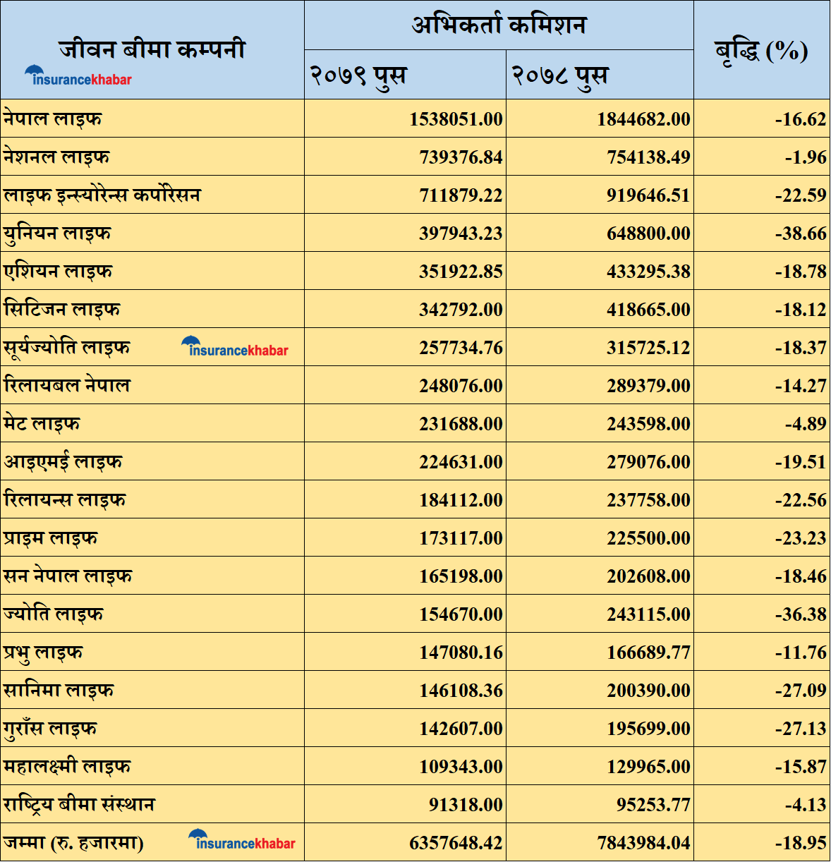 चालु आर्थिक वर्षको ६ महिनाको अवधिमा सर्वाधिक धेरै नेपाल लाइफका अभिकर्ताले एक अर्ब ५३ करोड रुपैयाँ कमिशन प्राप्त गरेका छन् । गत वर्षको यहि अवधिको तुलनामा १६.६२ प्रतिशतले कमिशनमा गिरावट आएको हो । दोस्रो धेरै कमिशन नेशनल लाइफका अभिकर्ताले प्राप्त गरेका छन् । नेशनलका अभिकर्ताले यस अवधिमा ७३ करोड ९३ लाख रुपैयाँ प्राप्त गरेका छन् ।