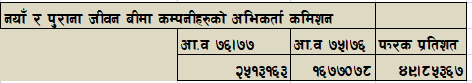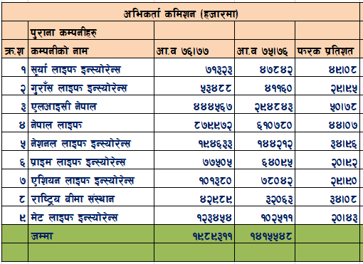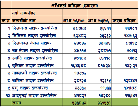 त्यस्तै, एलआइसी नेपालमा आबद्ध अभिकर्ताहरुले ४४ करोड ४५ लाख रुपैयाँ अभिकर्ता कमिशन वापतको रकम बुझेका छन् भने नेशनल लाइफ इन्स्योरेन्स कम्पनीका अभिकर्ताहरुले १९ करोड ४६ लाख रुपैयाँ अभिकर्ता कमिशन वापतको रकम बुझेका छन् ।