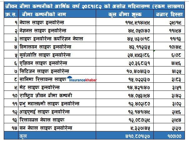 यस अवधिमा सबैभन्दा धेरै नेपाल लाइफले कुल बीमाशुल्क संकलन गरेको छ । कम्पनीले ११ अर्ब ९९ करोड रुपैयाँ कुल बीमाशुल्क संकलन गरेको हो । यस कम्पनीले कुल जीवन बीमा क्षेत्रको २९ दशलमव १९ प्रतिशत हिस्सा ओगटेको छ । दोस्रोमा नेशनल लाइफ रहेको छ ।