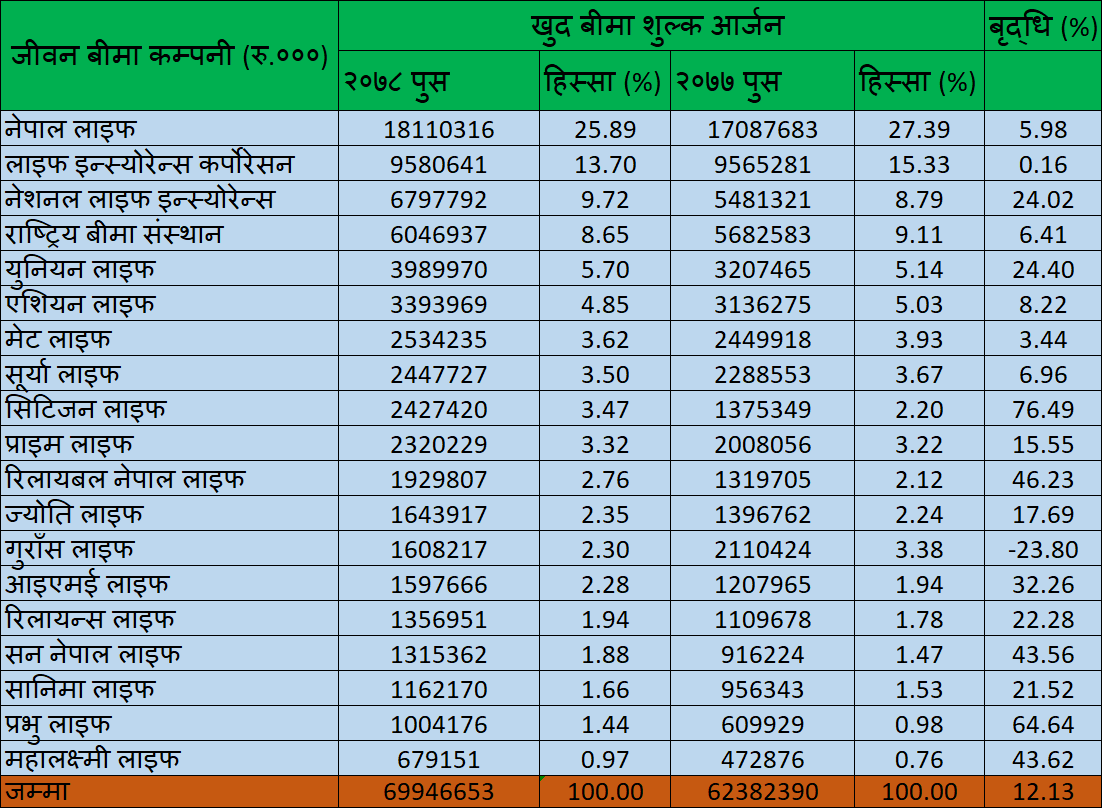 यस अवधिमा सबैभन्दा धेरै बीमा शुल्क आर्जन नेपाल लाइफले १८ अर्ब ११ करोड रुपैयाँ बीमा शुल्क आर्जन गरेको छ । नेपाल लाइफको मात्रै २५.८९ प्रतिशत बजार हिस्सा रहेको छ । गत वर्षको यहि अवधिमा २७.३९ प्रतिशत थियो । विगत केहि वर्षदेखि नेपाल लाइफको बजार हिस्सा भने लगातार घटिरहेको छ । हिस्सा घटे पनि बीमा शुल्क आर्जन भने लगातार बढिरहेको छ ।