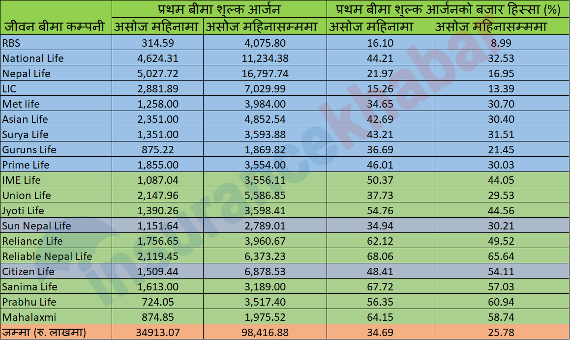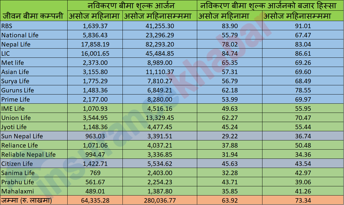 असोज महिनामा सबैभन्दा धेरै प्रथम बीमा शुल्क आर्जन नेपाल लाइफको छ । नेपाल लाइफले असोज एक महिनामा मात्रै ५० करोड रुपैयाँ बीमा शुल्क आर्जन गरेको छ । तर यसको नविकरण बीमा शुल्क आर्जन भने एक अर्ब ७८ करोड रुपैयाँ छ ।