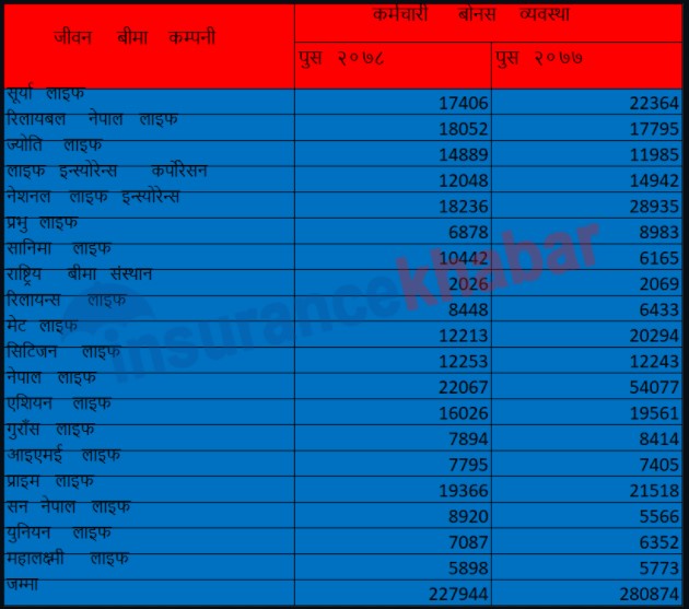 अहिलेको परिष्कृत वित्तीय विवरण अनुसार यस वर्ष सबैभन्दा धेरै बोनस नेपाल लाइफले आफ्ना कर्मचारीको लागि २ करोड २० लाख रुपैयाँ छुट्टाएको छ । त्यस्तै प्राइम लाइफले एक करोड ९३ लाख रुपैयाँ, नेशनल लाइफले एक करोड ८२ लाख रुपैयाँ, रिलायबल नेपालले एक करोड ८० लाख, सूर्या लाइफले एक करोड ७४ लाख, एशियन लाइफले एक करोड ६० लाख रुपैयाँ, ज्योति लाइफले एक करोड ४८ लाख रुपैयाँ, सिटिजन लाइफले एक करोड २२ लाख रुपैयाँ, मेट लाइफले एक करोड २२ लाख रुपैयाँ, लाइफ इन्स्योरेन्स कर्पोरेसनले एक करोड २० लाख रुपैयाँ, सानिमा लाइफले एक करोड ४ लाख रुपैयाँ छुट्टाएका छन् । अन्य कम्पनीहरुको भने एक करोड रुपैयाँ भन्दा कम छ ।