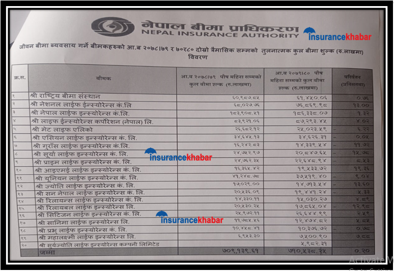 समिक्षा अवधिमा राष्ट्रिय बीमा संस्थानले ६ अर्ब १४ करोड, नेशनल लाइफ ७ अर्ब ६८ करोड, नेपाल लाइफ १८ अर्ब ८३ करोड, एलआइसी ८ अर्ब ७२ करोड, मेट लाइफ २ अर्ब ५० करोड, एशियन तीन अर्ब ४६ करोड, सूर्या लाइफ २ अर्ब ८ करोड, प्राइम २ अर्ब २६ करोड, आइएमई एक अर्ब ९५ करोड, युनियन तीन अर्ब ७५ करोड, ज्योति एक अर्ब ४७ करोड, सन नेपाल एक अर्ब ९४ करोड, रिलायन्स एक अर्ब ५० करोड, रिलायबल एक अर्ब ७८ करोड, सिटिजन २ अर्ब ६६ करोड, सानिमा एक अर्ब २४ करोड, प्रभु एक अर्ब तीन करोड, महालक्ष्मी ७५ करोड र सूर्यज्योती लाइफले ५९ करोड ८२ लाख रुपैयाँ बीमा शुल्क आर्जन गरेका छन् ।
