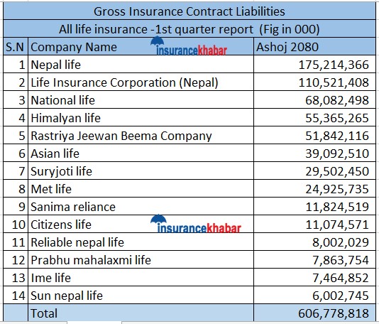 सूर्यज्योति लाइफको जीवन बीमा कोषमा २९ अर्ब ५० करोड २४ लाख रुपैयाँ रहेको छ । मेट लाइफको २४ अर्ब ९२ करोड ५७ लाख रुपैयाँ रहेको छ । सानिमा रिलायन्स लाइफको जीवन बीमा कोषमा ११ अर्ब ८२ करोड ४५ लाख रुपैयाँ रहेको छ । सिटिजन लाइफको जीवन बीमा कोषमा ११ अर्ब ७ करोड ४५ लाख रुपैयाँ रहेको छ । रिलायबल नेपाल लाइफको जीवन बीमा कोषमा ८ अर्बमाथि रहेको छ ।