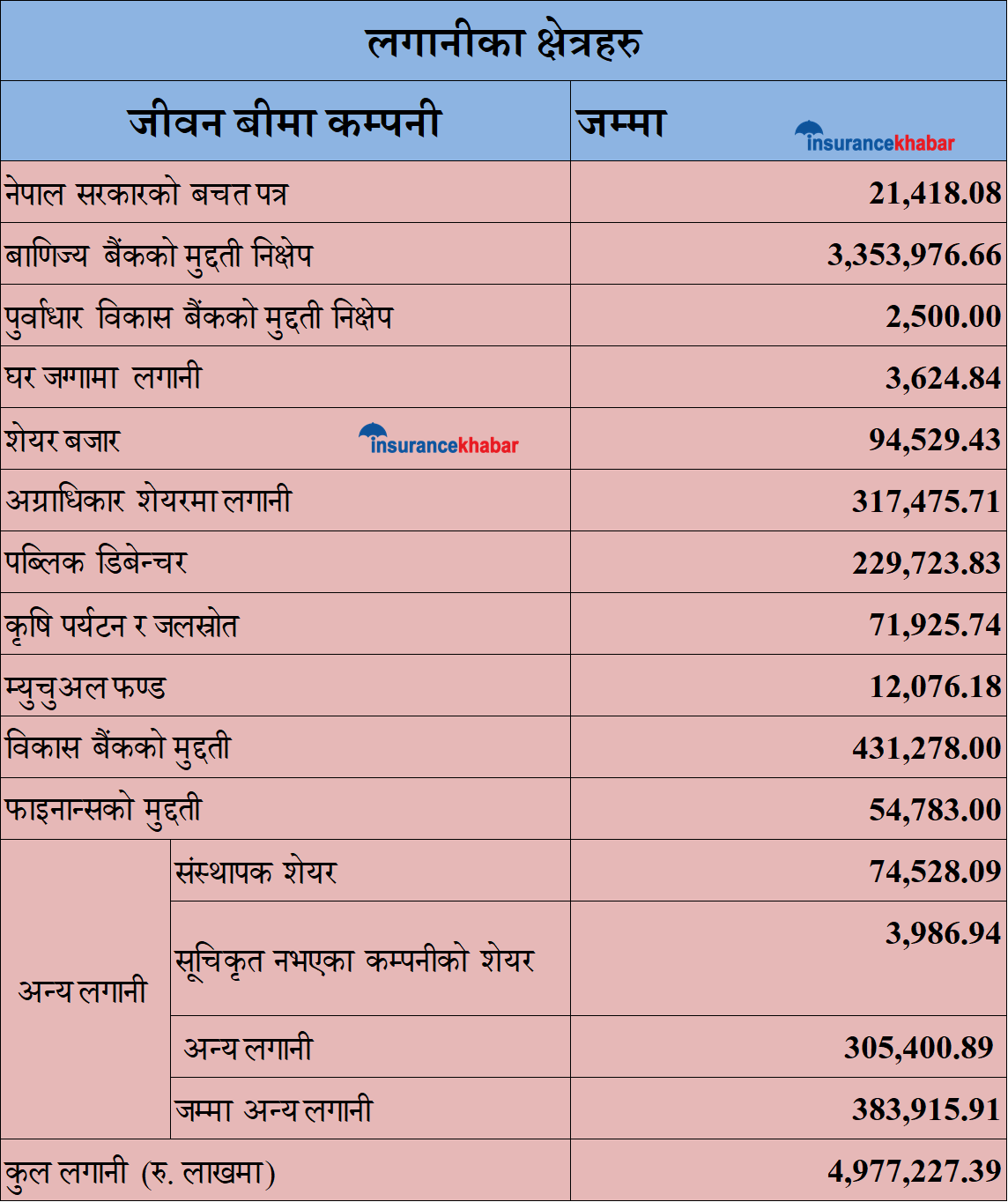 जीवन बीमा कम्पनीहरुले सर्वाधिक धेरै वाणिज्य बैंकको मुदद्ती निक्षेपमा लगानी गरेका छन् । बीमा कम्पनीहरुले सुरक्षित लगानीको रुपमा वाणिज्य बैंकको मुद्दती निक्षेपमा लगानी गर्ने गरेका छन् । यसको हिस्सा ६७.३८ प्रतिशत छ । कम्पनीले तीन खर्ब ३५ अर्ब वाणिज्य बैंकको मुद्दतीमा लगानी गरेर राखेका छन् । बीमा कम्पनीहरुले अहिले यस्तो लगानीबाट राम्रो आम्दानी गरिरहेका छन् । दोस्रो धेरै लगानी विकास बैंकको मुद्दती निक्षेपमा छ । यस क्षेत्रमा जीवन बीमा कम्पनी ८.६६ प्रतिशत लगानी रहेको छ ।