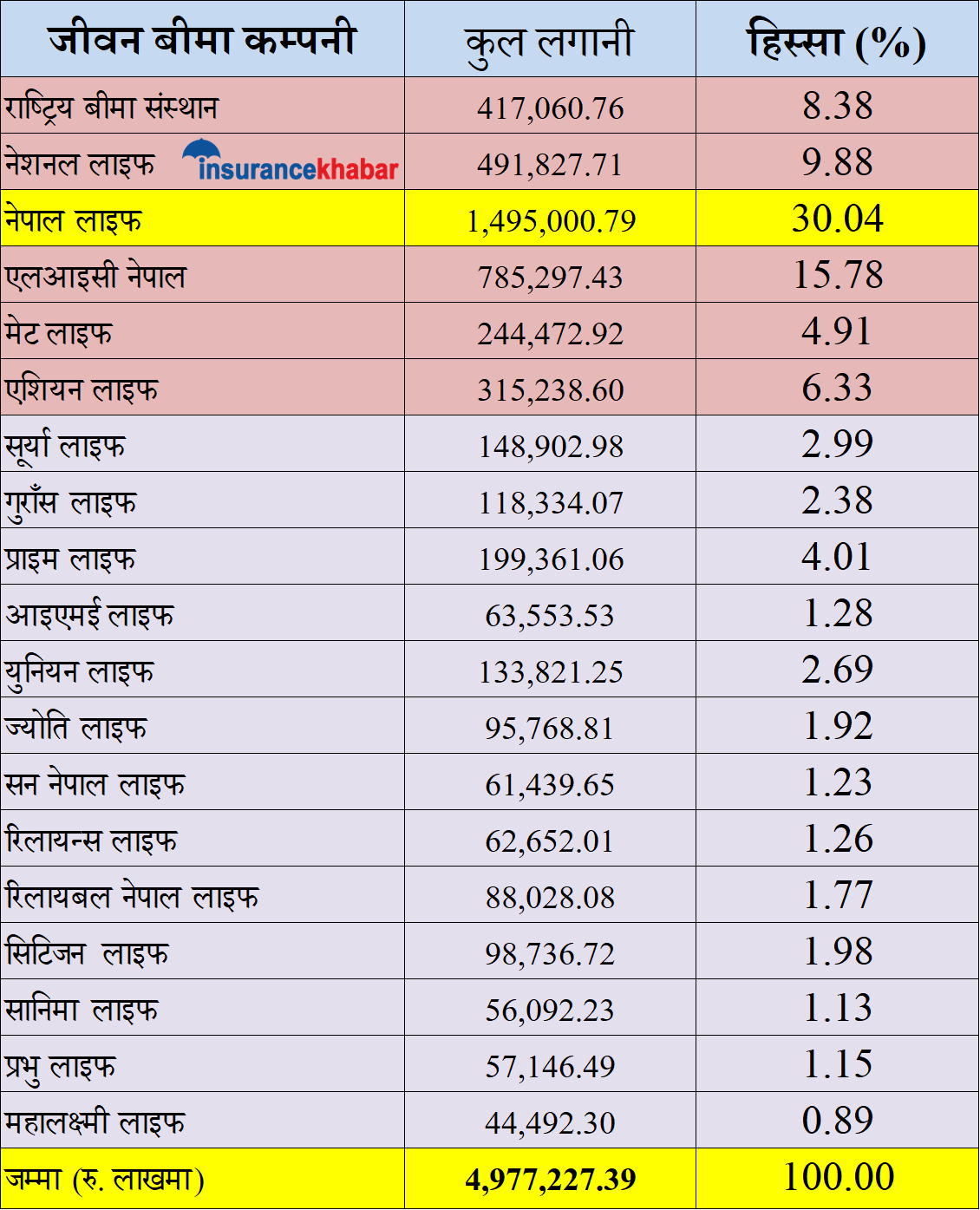 काठमाडौं । जीवन बीमा कम्पनीहरुको लगानी झण्डै ५ खर्ब रुपैयाँ नजिक पुग्न थालेको छ । चालु आर्थिक वर्षको पहिलो त्रैमासिक अवधिमा जीवन बीमा कम्पनीहरुले विभिन्न क्षेत्रमा ४ खर्ब ९७ अर्ब रुपैयाँ लगानी गरेका छन् । यस मध्ये सर्वाधिक धरै नेपाल लाईफको मात्रै एक खर्ब ४९ अर्ब ५० करोड रुपैयाँ रहेको छ । जीवन बीमा उद्योगको कुल लगानी मध्ये नेपाल लाइफकै हिस्सा ३० प्रतिशत माथि छ ।