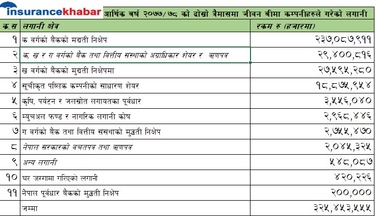 दोस्रोमा लाइफ इन्स्योरेन्स कम्पनी रहेको छ। कम्पनीले यस अवधिसम्ममा ५९ अर्ब ६८ करोड रुपैयाँ र तेस्रोमा नेशनल लाइफले ३५ अर्ब ४५ करोड रुपैयाँ लगानी गरेका छन्।