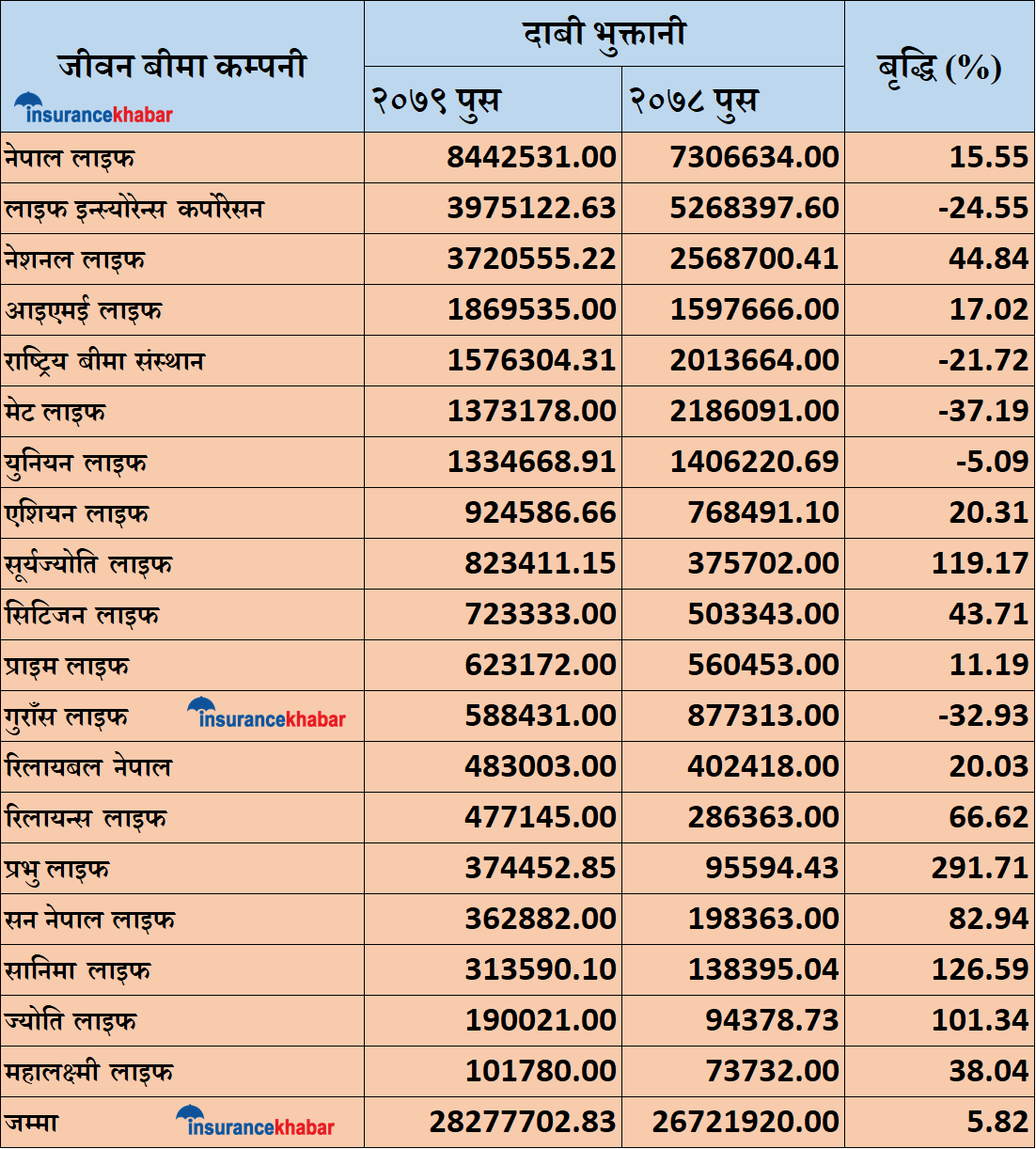 समिक्षा अवधिमा सर्वाधिक धेरै नेपाल लाइफले ८ अर्ब ४४ करोड रुपैयाँको दाबी भुक्तानी गरेको छ । गत वर्षको तुलनामा यस वर्ष १५.५५ प्रतिशतले दाबी भुक्तानी बढेको छ । लाइफ इन्स्योरेन्स कर्पोरेसनको दाबी भुक्तानी भने २३ प्रतिशतले घटेको छ । कम्पनीले पुस मसान्तसम्ममा तीन अर्ब ९७ करोड रुपैयाँको दाबी भुक्तानी गरेका छन् ।