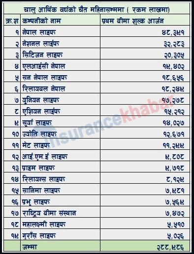 समितिको तथ्याङक अनुसार चैत महिनासम्ममा सबैभन्दा धेरै नेपाल लाइफले प्रथम बीमा शुलक आर्जन गरेको छ । कम्पनीले यस अवधिसम्ममा ४ अर्ब ८३ करोड ९१ लाख रुपैयाँ प्रथम बीमा शुल्क आर्जन गरेको छ । दोस्रोमा नेशनल लाइफ रहेको छ । कम्पनीले यस अवधिसम्ममा ३ अर्ब २२ करोड ८३ लाख रुपैयाँ प्रथम बीमा शुल्क आर्जन गरेको छ । तेस्रोमा सिटिजन लाइफ रहेको छ । कम्पनीले यस अवधिमा २ अर्ब ३ करोड ५ लाख रुपैयाँ प्रथम बीमा शुल्क आर्जन गरेको छ ।