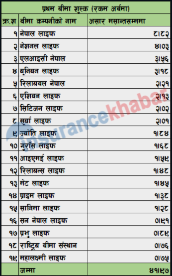 त्यसैगरी रिलायबल नेपाल लाइफले २ अर्ब २१ करोड, एशियन लाइफले २ अर्ब १३ करोड रुपैयाँ, सिटिजन लाइफ इन्स्योरेन्स कम्पनीले २ अर्ब २ करोड, सूर्या लाइफ इन्स्योरेन्स कम्पनीले २ अर्ब १ करोड, ज्योति लाइफले १ अर्ब ८४ करोड, गुराँस लाइफ इन्स्योरेन्स कम्पनीले १ अर्ब ६८ करोड, आइएमई लाइफले १ अर्ब ५९ करोड, रिलायन्स लाइफले १ अर्ब ४८ करोड, मेट लाइफले १ अर्ब ४५ करोड, प्राइम लाइफले १ अर्ब ३८ करोड, सानिमा लाइफले १ अर्ब २८ करोड रुपैयाँ प्रथम बीमा शुल्क आर्जन गर्न सफल भएका छन् ।