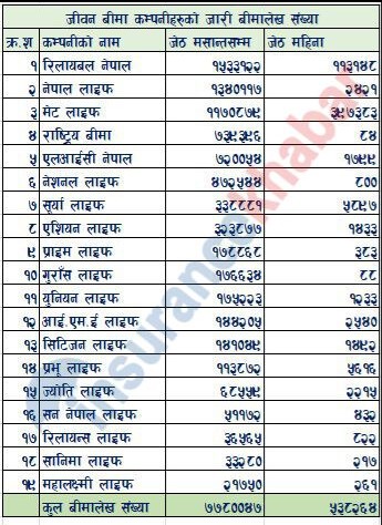 त्यस्तै, आइएमई लाइफले १ लाख ४४ हजार २०५ वटा बीमालेख जारी गरेको छ भने जेठ महिनामा मात्रै २५ सय ४० वटा बीमालेख जारी गरेको छ । सिटिजन लाइफले १ लाख ४१ हजार ४९ वटा बीमालेख जारी गरेको छ भने जेठ महिनामा मात्रै १४ सय ९२ वटा बीमालेख जारी गरेको छ । प्रभु लाइफले १ लाख १३ हजार ८७२ वटा बीमालेख जारी गरेको छ भने जेठ महिनामा मात्रै ५ हजार ६ सय १६ वटा बीमालेख जारी गरेको छ ।