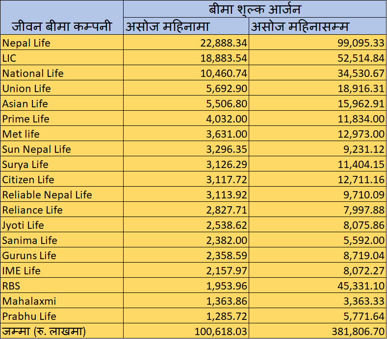 यस अवधिमा सबैभन्दा धेरै नेपाल लाइफले मात्रै ९ अर्ब ९० करोड रुपैयाँ आर्जन गरेको छ । असोज एम महिनामा मात्रै भने २ अर्ब २८ करोड रुपैयाँ आर्जन गरेको छ । त्यस्तै दोस्रो धेरै बीमा शुल्क आर्जन गरेमा लाइफ इन्स्योरेन्स कर्पोरेसन रहेको छ । कम्पनीले तीन महिनाको अवधिमा ५ अर्ब २५ करोड रुपैयाँ संकलन गरेको हो । त्यस्तै असोज एक महिनामा मात्रै हेर्ने हो भने एक अर्ब ८८ करोड रुपैयाँ छ । तेस्रो स्थानमा रहेको नेशनलले ३ अर्ब ४५ करोड रुपैयाँ आर्जन गरेको छ । चौथो स्थानमा रहेको युनियन लाइफले पहिलो त्रैमाशिक अवधिमा एक अर्ब ८९ करोड रुपैयाँ बीमा शुल्क आर्जन गरेको छ ।