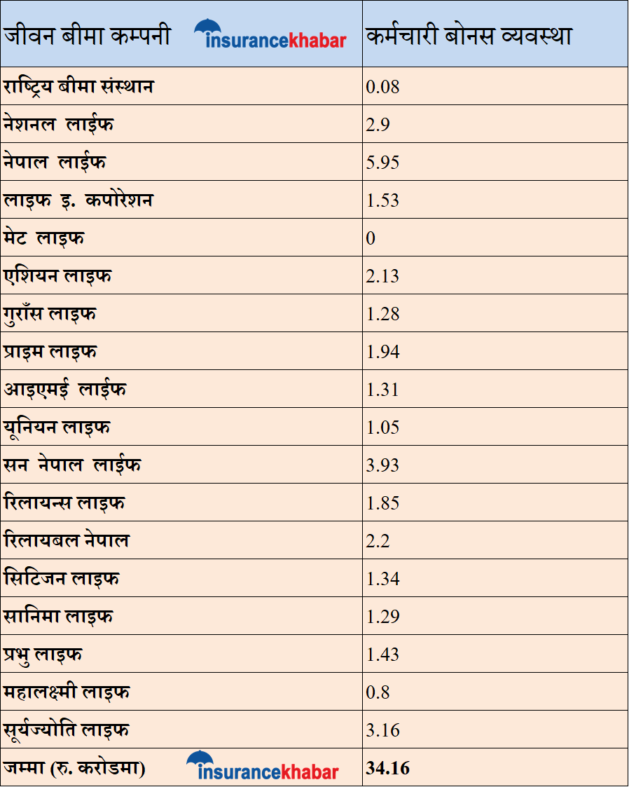 काठमाडौं । जीवन बीमा कम्पनीहरुले ६ महिनाको मुनाफाबाट कर्मचारीका लागि ३४ करोड १५ लाख रुपैयाँ बोनस छुट्टाएका छन् । जीवन बीमा कम्पनीहरुले गत वर्षको यहि अवधिमा १८ करोड ७१ लाख रुपैयाँ छुट्टाएका थिए ।