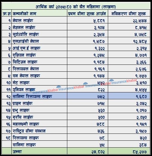 चैत महिनामा मेट लाइफले ९ करोड ५२ लाख, यूनियन लाइफले ८ करोड २२ लाख, सानिमा रिलायन्स लाइफले ७ करोड ९२ लाख, प्राइम लाइफले ७ करोड १९ लाख, प्रभु लाइफले ५ करोड ३० लाख, गुराँस लाइफले ५ करोड, महालक्ष्मी लाइफले ४ करोड ८८ लाख, राष्ट्रिय बीमा संस्थानले ४ करोड ३६ लाख, रिलायन्स लाइफले ७८ लाख र सानिमा लाइफले ५९ लाख रुपैयाँ मात्रै प्रथम बीमा शुल्क आर्जन गरेका छन् ।