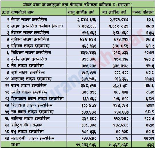 जीवन बीमा कम्पनीहरुले प्रकाशन गरेको तेस्रो त्रैमासको वित्तीय विवरण अनुसार युनियन लाइफले तेस्रो त्रैमाससम्मा ९६ करोड ४९ लाख रुपैयाँ, एशियन लाइफले ५६ करोड ३१ लाख रुपैयाँ, सिटिजन लाइफले ४५ करोड ७४ लाख रुपैयाँ, गुराँस लाइफले ४५ करोड ३ लाख रुपैयाँ, मेट लाइफले ४० करोड १ लाख रुपैयाँ, सूर्या लाइफले ३६ करोड २५ लाख रुपैयाँ आइएमई लाइफले ३५ करोड १७ लाख रुपैयाँ, प्राइम लाइफले ३४ करोड ८५ लाख रुपैयाँ र ज्योति लाइफले ३४ करोड ५ लाख रुपैयाँ बीमा अभिकर्ता कमीशनमा खर्चिएका छन् ।
