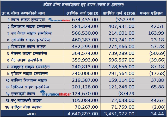 नेशनल लाइफ इन्स्योरेन्सको नाफा अघिल्लो वर्षको तुलनामा ५० प्रतिशतले घटेको छ । यस अवधिमा कम्पनीले ३६ करोड ४५ लाख रुपैयाँ नाफा आर्जन गरेको छ । मेट लाइफको नाफा अघिल्लो वर्षको तुलनामा ३९ प्रतिशतले घटेको छ । कम्पनीले यस अवधिमा ३५ करोड ९९ लाख रुपैयाँ नाफा कमाएको छ । एशियन लाइफको नाफा अघिल्लो वर्षको तुलनामा १७ प्रतिशतले घटेको छ । कम्पनीले यस अवधिमा २४ करोडमाथि नाफा आर्जन गरेको छ । राष्ट्रिय बीमा संस्थानको नाफा २ प्रतिशतले घटेको छ । कम्पनीले यस अवधिमा ७ करोड २ लाख आर्जन गरेको छ ।