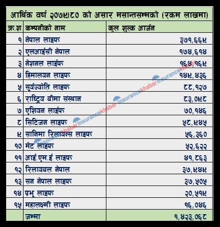 त्यस्तै, हिमालयन लाइफले १४ अर्ब ९४ करोड ३६ लाख रुपैयाँ, सूर्यज्योति लाइफले ८ अर्ब ८१ करोड २७ लाख रुपैयाँ, राष्ट्रिय बीमा संस्थानले ८ अर्ब ३० करोड ९८ लाख, एशियन लाइफले ७ अर्ब १ करोड, ४६ लाख, सिटिजन लाइफले ५ अर्ब ८९ करोड ४५ लाख, सानिमा रिलायन्स लाइफले ५ अर्ब ६३ करोड ६० लाख, मेट लाइफले ५ अर्ब २६ करोड २२ लाख रुपैयाँ कुल बीमा शुल्क आर्जन गर्न सफल भएका छन् ।