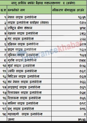 त्यस्तै, रिलायबल लाइफले २९ करोड रुपैयाँ, ज्योति लाइफले ३८ करोड रुपैयाँ, आइएमई लाइफले ३१ करोड रुपैयाँ, सन नेपाल लाइफले ३३ करोड रुपैयाँ, रिलायन्स लाइफले २६ करोड रुपैयाँ प्रभु लाइफले १६ करोड रुपैयाँ र सानिमा लाइफले १८ करोड रुपैयाँ नविकरण बीमाशुल्क आर्जन गर्न सफल भएका छन् ।