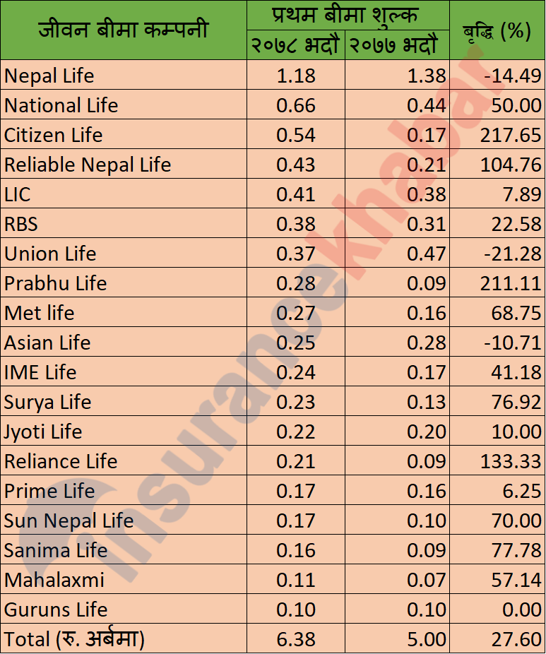 दुई महिनाको अवधिमा १९ जीवन बीमा कम्पनीहरुले ६ अर्ब ३८ करोड रुपैयाँ प्रथम बीमा शुल्क आर्जन गरेका छन् । गत वर्षको यहि अवधिमा भने ५ अर्ब रुपैयाँ थियो । यस वर्ष बीमा समितिले असार महिनामा कडाइ गर्दा असारमा पोलिसी काट्न नभएकाहरुले साउनमा काटेका थिए ।