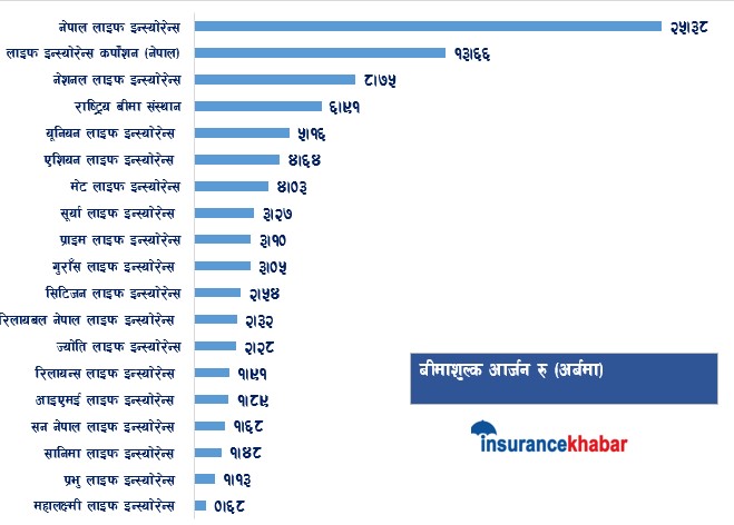 समितिको तथ्याङ्क अनुसार चालु आर्थिक बर्षको ९ महिनाको अवधिमा सरकारी स्वामित्वमा रहेको राष्ट्रिय बीमा संस्थानले ६ अर्ब ९१ करोड रुपैयाँ, यूनियन लाइफले ५ अर्ब १६ करोड रुपैयाँ, एशियन लाइफले ४ अर्ब ६४ करोड रुपैयाँ, मेट लाइफले ४ अर्ब ३ करोड रुपैयाँ, सूर्या लाइफले ३ अर्ब २७ करोड रुपैयाँ, प्राइम लाइफले ३ अर्ब १० करोड रुपैयाँ, गुँरास लाइफले ३ अर्ब ५ करोड रुपैयाँ र सिटिजन लाइफले २ अर्ब ५४ करोड रुपैयाँ बीमाशुल्क आर्जन गर्न सफल भएका छन् ।