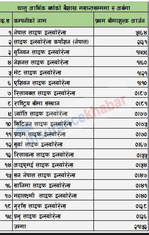 त्यस्तै, नेशनल लाइफले १अर्ब ६० करोड रुपैयाँ, मेट लाइफले १ अर्ब २१ करोड रुपैयाँ, एशियन लाइपले १ अर्ब १० करोड रुपैयाँ, रिलायबल लाइफले ८७ करोड रुपैयाँ, राष्ट्रिय बीमा संस्थाले ८१ करोड रुपैयाँ, ज्योति लाइफले ७७ करोड रुपैयाँ र सिटिजन लाइफले ७५ करोड रुपैयाँ प्रथम बीमाशुल्क आर्जन गर्न सफल भएका छन् ।