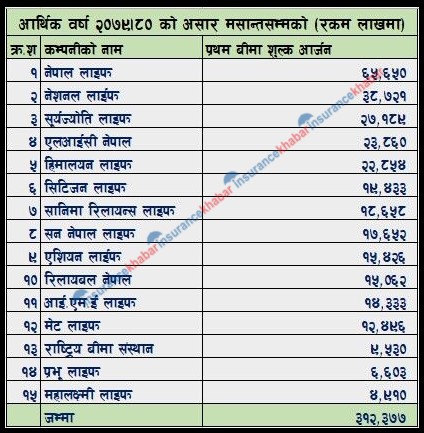 त्यस्तै, एलआइसी नेपालले २ अर्ब ३८ करोड ६० लाख, हिमालयन लाइफले २ अर्ब २८ करोड ५४ लाख, सिटिजन लाइफले १ अर्ब ९४ करोड ३३ लाख, सानिमा रिलायन्स लाइफले १ अर्ब ८६ करोड ५८ लाख, सन नेपाल लाइफले १ अर्ब ७६ करोड ५२ लाख, एशियन लाइफले १ अर्ब ५४ करोड २६ लाख रुपैयाँ प्रथम बीमा शुल्क आर्जन गरेका हुन् ।