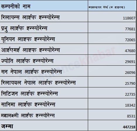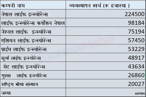 प्राईम लाईफले ५ करोड ३२ लाख रुपैयाँ, सूर्या लाईफले चार करोड ८९ लाख रुपैयाँ, मेट लाईफले चार करोड ३६ लाख रुपैयाँ, गुराँस लाईफले दुई करोड ६८ लाख रुपैयाँ र सरकारी स्वामित्वमा रहेको राष्ट्रिय बीमा संस्थान दुई करोड रुपैयाँ व्यवस्थापन खर्च गरेका छन् ।