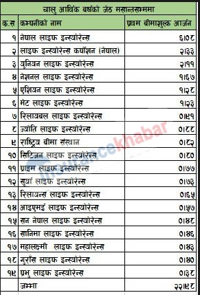 सूर्या लाइफले ७३ करोड रुपैयाँ, रिलायन्स लाइफले ६५ करोड रुपैयाँ, आइएमई लाइफले ५७ करोड रुपैयाँ, सन नेपाल लाइफले ४८ करोड रुपैयाँ, सानिमा लाइफले ४६ करोड रुपैयाँ, महालक्ष्मी लाइफले ४३ करोड रुपैयाँ, गुराँस लाइफले ४० करोड रुपैयाँ, प्रभु लाइफले ३८ करोड रुपैयाँ प्रथम बीमाशुल्क मार्फत आर्जन गर्न सफल भएका छन् ।