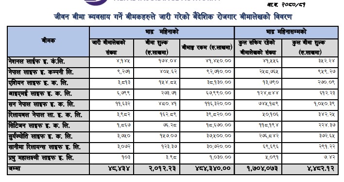 भदौ महिनासम्ममा वैदेशिक रोजगारी बीमालेख मार्फत नेशनल लाइफले ४१ हजार ५५६ वटा बीमालेख बिक्री गरी ३ करोड ५२ लाख रुपैयाँ कुल बीमाशुल्क आर्जन गरेको छ । नेपाल लाइफले २ लाख ५८ हजार ७६५ वटा बीमालेख बिक्री गरी ९ करोड ५९ लाख रुपैयाँ कुल बीमाशुल्क आर्जन गरेको छ ।