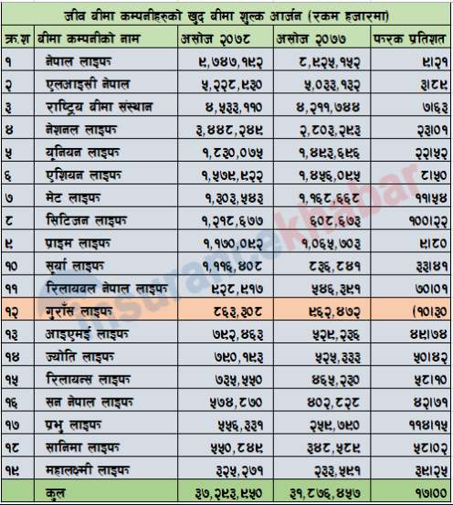 काठमाडौं । जीवन बीमा कम्पनीहरुको व्यवसायिक बृद्धि हरेक समिक्षा अवधिमा बृद्धि भएको तथ्याङ पाइन्छ । यस समिक्षा अवधिमा पनि १९ जीवनबीमा कम्पनीहरुमध्ये गुराँस लाइफ इन्स्योरेन्स कम्पनीको गत आर्थिक वर्षको सोही अवधिको तुलनामा १० प्रतिशतले खुद बीमा शुल्क आर्जन घटेको छ । गुराँस लाइफ बाहेक सबै बीमा कम्पनीको व्यवसायमा विस्ता भएको पाइएको छ ।
