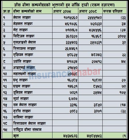 यस अवधिमा एलआइसी नेपालको भुक्तानी हुन बाँकि दाबी रकम ३३ करोड ५४ लाख रुपैयाँ रहेको छ । रिलायन्स लाइफको भुक्तानी हुन बाँकि दाबी रकम २६ करोड ४४ लाख रुपैयाँ, एशियन लाइफको ५ करोड ४६ लाख, ज्योति लाइफको ४ करोड १७ लाख रुपैयाँ, आइएमई लाइफको २ करोड १९ लाख रुपैयाँ,महालक्ष्मी लाइफको २ करोड रुपैयाँ रहेको छ ।