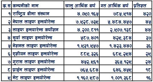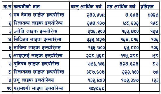 सन नेपाल लाइफ इन्स्योरेन्स कम्पनीले असोज मसान्तमा कुल बीमा शुल्क आर्जन रकम ५०६९ प्रतिशतले बढाउन सफल भएको छ भने रिलायन्स लाईफ इन्स्योरेन्सले कुल बीमा शुल्क आर्जन १५८ प्रतिशतले वृद्धि गर्न सफल भएको छ।