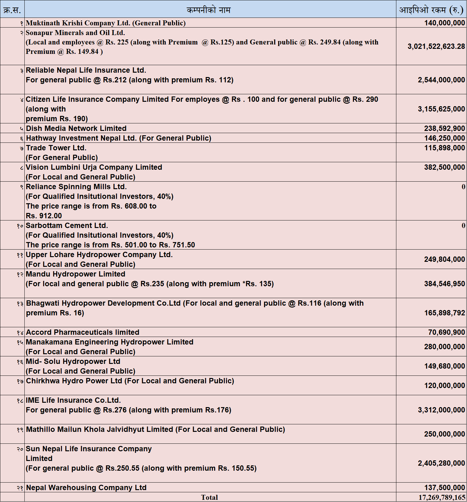 सोनापुर मिनरल एण्ड आयलले पनि स्थानीय बासिका लागि १२५ रुपैयाँ प्रिमियम सहित २२५ रुपैयाँ र सर्वसाधारणका लागि १४९.८४ रुपैयाँ प्रिमियम सहित २४९.८४ रुपैयाँको दरमा ३ अर्ब २ करोड रुपैयाँ बराबरको आइपिओ निष्काशनका लागि धितोपत्र बोर्डमा आवेदन दिएको छ ।