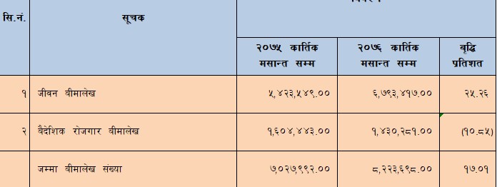 जीवन बीमा कम्पनीहरुले गत बर्ष जीवन बीमालेख र वैदेशिक बीमालेखबाट कुल ७० लाख २७ हजार बीमालेख बिक्री गरेका थिए भने चालु आर्थिक बर्षको कात्तिक मसान्तसम्ममा जीवन बीमा र वैदेशिक बीमालेखबाट ८२ लाख २३ हजार ६ सय ६९ वटा बीमालेख बिक्री गरेका छन् । गत बर्षको तुलनामा १७ प्रतिशतले कुल जीवन बीमालेख सङख्यामा वृद्धि भएको देखिएको छ ।