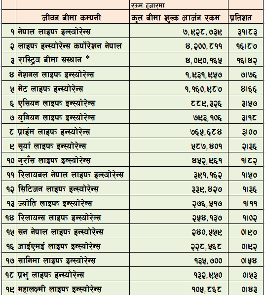 नोट : रास्ट्रिय बीमा सस्थानको खुद बीमा शुल्क आर्जन रकम प्रयोग गरिएको