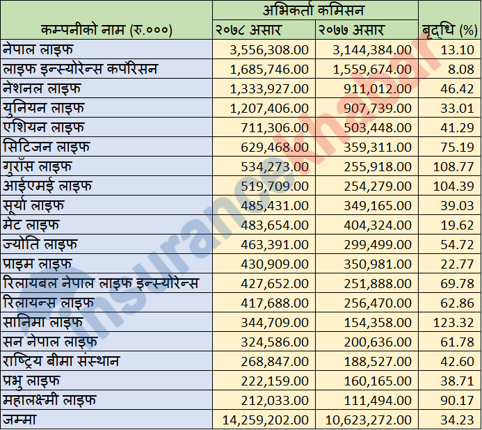 एशियन लाइफले अभिकर्ताका लागि ७१ करोड १३ लाख रुपैयाँ खर्च गरेको छ । कम्पनीले अघिल्लो आर्थिक वर्षमा अभिकर्ता कमिसन ५० करोड ३४ लाख रुपैयाँ थियो । नयाँ जीवन बीमा कम्पनी सिटिजन लाइफको अभिकर्ता कमिसन ७५ प्रतिशतले बढेर ६२ करोड ९४ लाख रुपैयाँ पुगेको छ ।