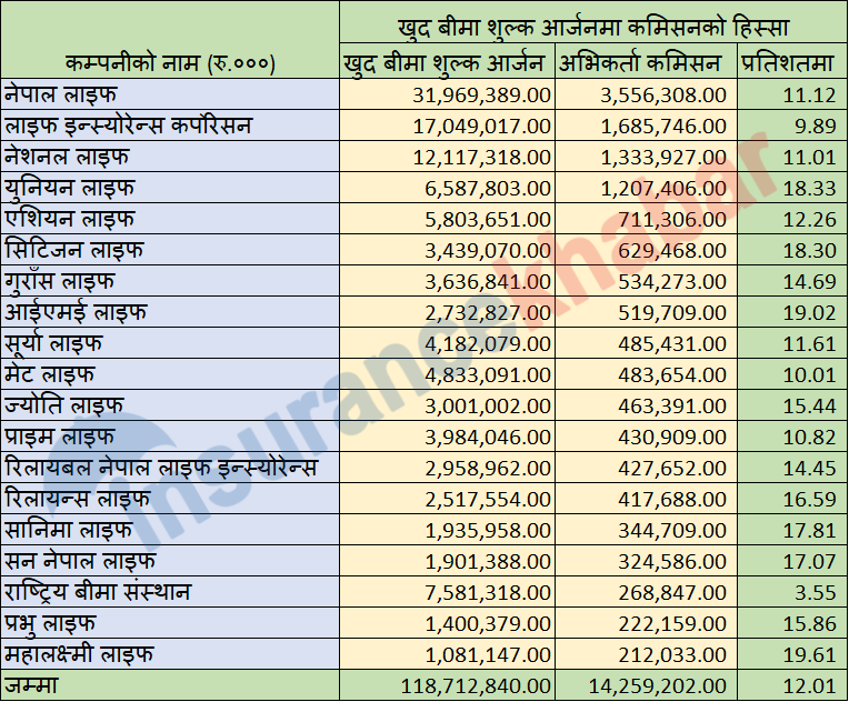 गत वर्ष जीवन बीमा व्यवसाय २९.४६ प्रतिशतले बृद्धि भएको थियो । कम्पनीहरुले एक खर्ब १८ अर्ब रुपैयाँ खुद बीमा शुल्क आर्जन गर्दा अभिकर्ताले भने १४ अर्ब २५ करोड रुपैयाँ कमिसन तथा इन्सेन्टिभ प्राप्त गरेका हुन् । बीमा कम्पनीहरुको अभिकर्ताका लागि औषतमा १२ प्रतिशत खर्च भएको छ ।