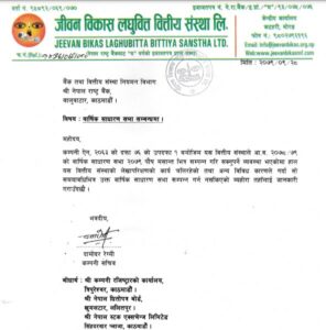 काठमाडौं । जीवन विकास लघुवित्त वित्तीय संस्था लिमिटेडले साधारणसभा नगर्ने भएको छ ।