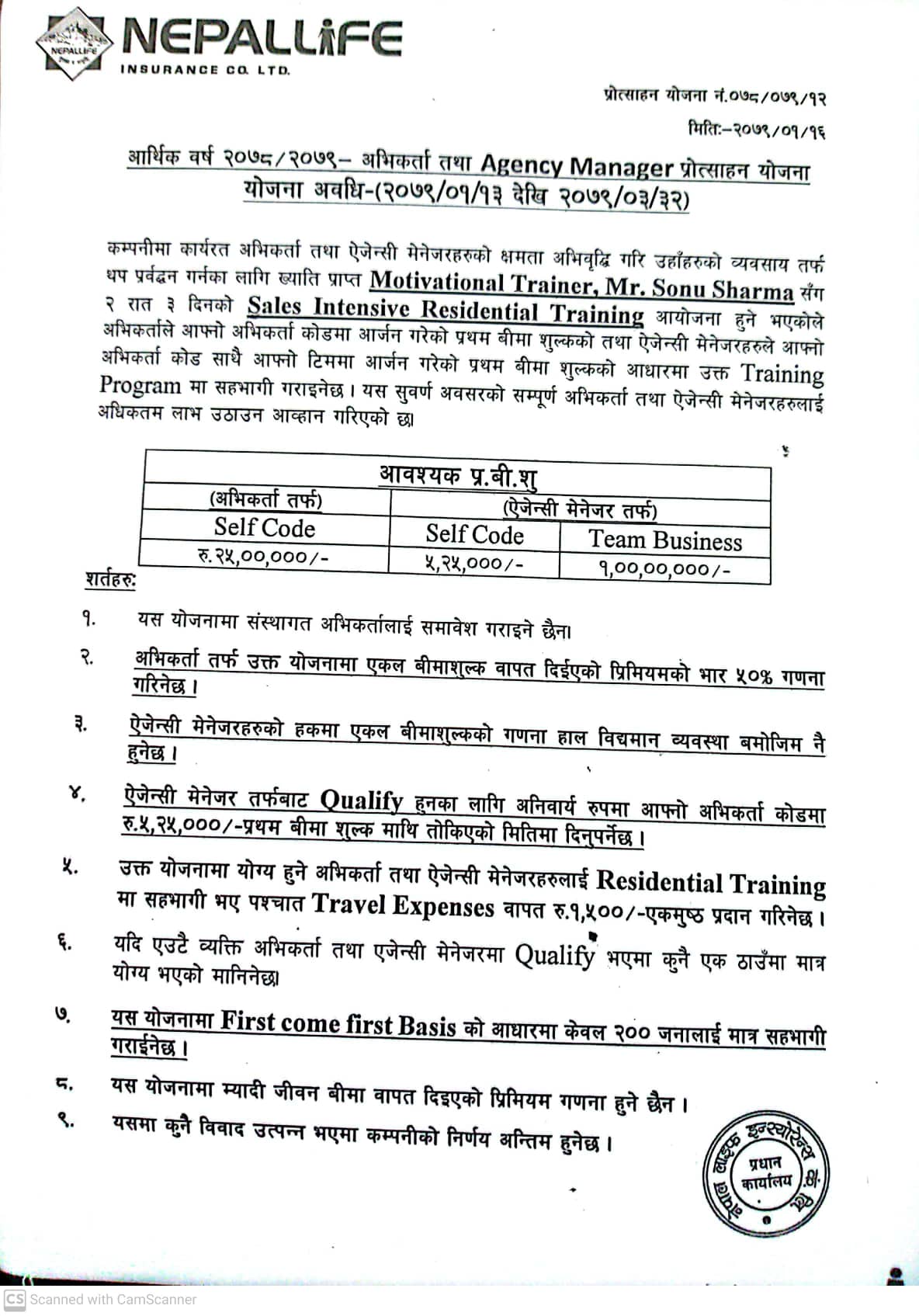 कम्पनीमा कार्यरत अभिकर्ता तथा एजेन्सी म्यानेजरहरुको क्षमता अभिबृद्धि गरी उनिहरुको व्यवसाय तर्फ थप प्रवर्द्धन गर्नका लागि ख्याति प्राप्त मोटिभेस्नल ट्रेनर सोनु शर्मा सँग २ रात तीन दिनको सेल्स इन्टेन्सिभ रेसिडेन्टल ट्रेनिङ आयोजना गर्ने भएको छ । तोकिएको टार्गेट पुरा गर्ने अभिकर्ताहरुलाई मात्रै यस कार्यक्रममा सहभागी गराइने कम्पनीले जनाएको छ ।