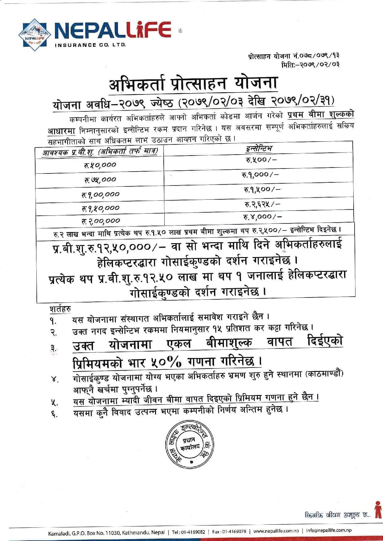 काठमाडौं । जेठ महिनामा टार्गेट पुरा गर्ने अभिकर्तालाई नेपाल लाइफले हेलिकप्टबाट गोसाइकुण्ड दर्शन गराउने भएको छ । यसका लागि अभिकर्ताले जेठ महिनामा कम्तिमा पनि १२ लाख ५० हजार रुपैयाँ प्रथम बीमा शुल्क आर्जन गर्नु पर्नेछ । त्यस्तै प्रत्येक थप १२ लाख ५० हजार रुपैयाँ प्रथम बीमा शुल्क आर्जन गर्दा थप एक जनालाई गोसाईकुण्ड दर्शन गराइने कम्पनीले जनाएको छ ।