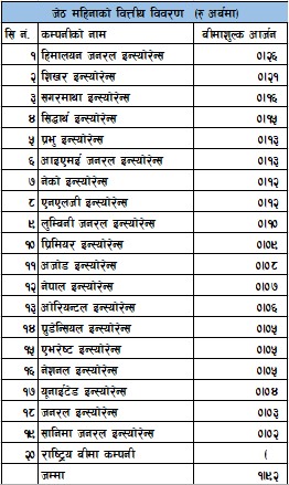 बीमा समितिको तथ्याङ्क अनुसार चालु आर्थिक बर्षको जेठ महिनामा अजोड इन्स्योरेन्सले ८ करोड रुपैयाँ नेपाल इन्स्यारेन्सले ७ करोड रुपैयाँ, ओरियन्टल इन्स्योरेन्सले ६ करोड रुपैयाँ, पु्रडेन्सियल इन्स्योरेन्सले ५ करोड रुपैयाँ, एभरेष्ट इन्स्योरेन्सले ५ करोड रुपैयाँ, नेश्नल इन्स्योरेन्सले ५ करोड रुपैयाँ, युनाईटेड इन्स्योरेन्सले ४ करोड रुपैयाँ, जनरल इन्स्योरेन्सले ३ करोड रुपैयाँ र सानिमा इन्स्योरेन्सले २ करोड रुपैयाँ बीमाशुल्क आर्जन गर्न सफल भएका छन् ।