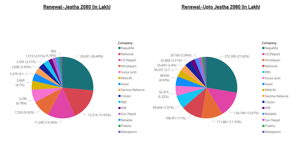 नविकरण बीमा शुल्क आर्जन तर्फ सर्वाधिक धेरै हिस्सा नेपाल लाइफको २७.६२ प्रतिशत रहेको छ भने दोस्रो स्थानमा रहेको एलआइसी नेपालकाे हिस्सा १३.६७ प्रतिशत छ । तीन वटा कम्पनी मर्जर पछि नविकरण तर्फ हिमालयन लाइफ तेस्रो स्थानमा छ । हिमालयन लाइफको नविकरण व्यवसायमा बजार हिस्सा ११.३३ प्रतिशत मात्रै छ । यो तीन वटा कम्पनीको संयुक्त व्यवसाय हो । जेठ महिनाको मात्रै नविकरण बीमा शुल्क आर्जनमा नेशनल लाइफको बजार हिस्सा १७.०५ प्रतिशत छ ।